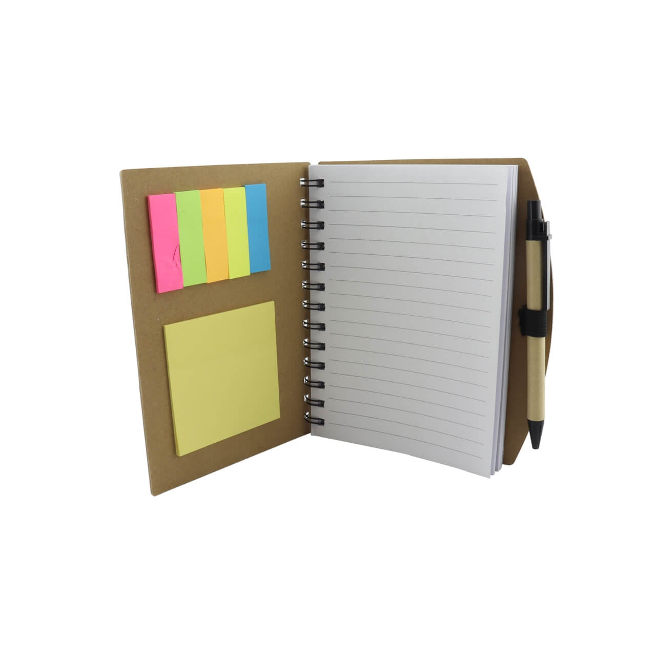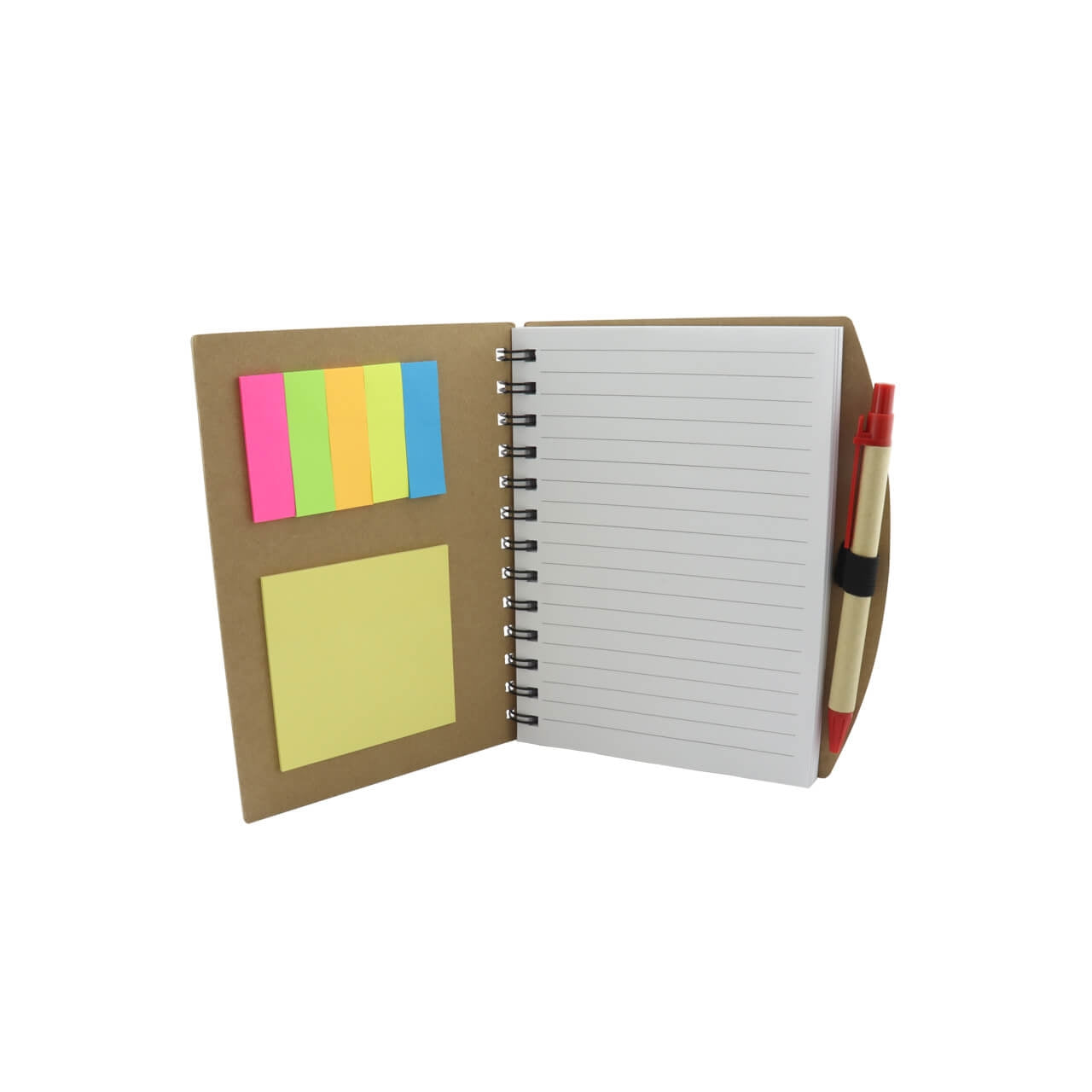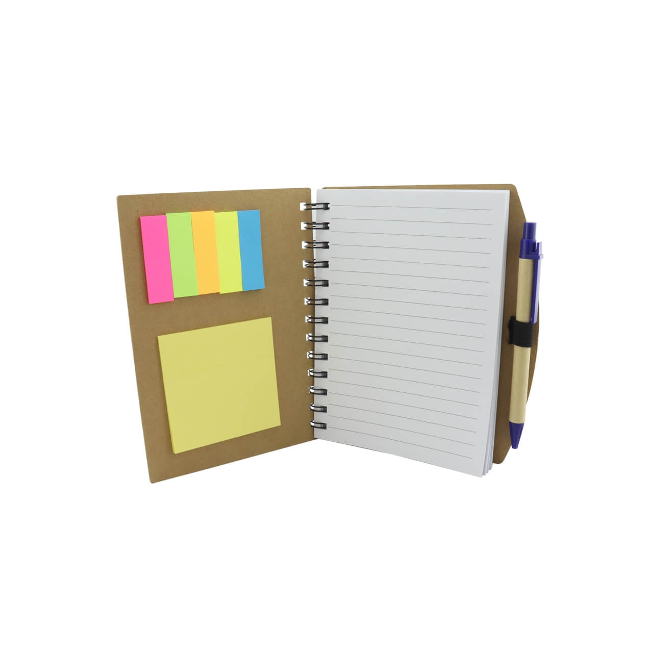 Cuaderno doble O caratula y contracaratula en cartón con esfero incluido, mini Notas adhesivas en 5 colores, 70 Hojas Rayadas.