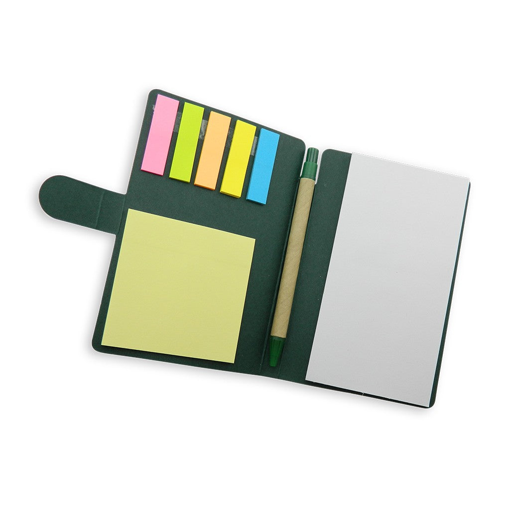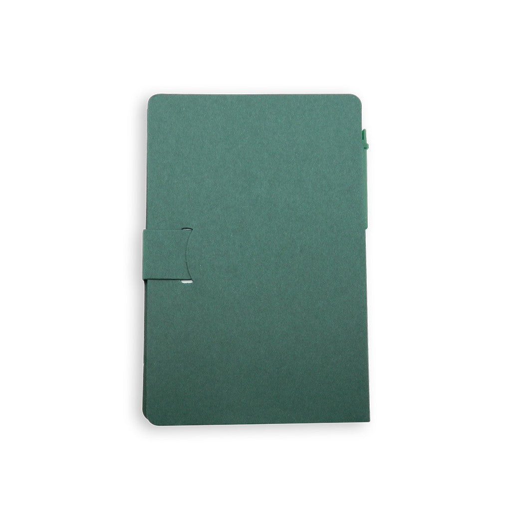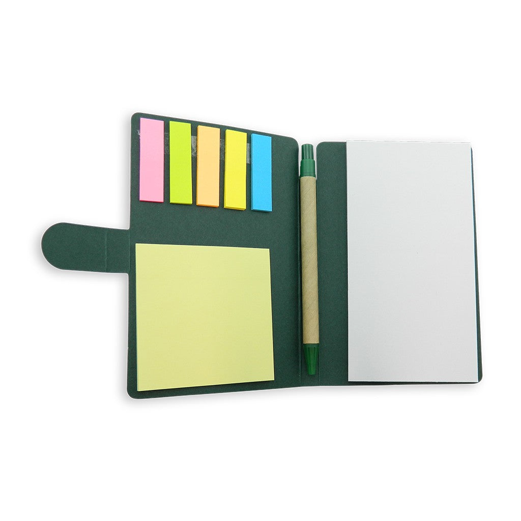Taco con hojas blancas desprendibles. Incluye esfero ecológico y notas adhesivas. 75 hojas blancas y 114 notas adhesivas aprox.