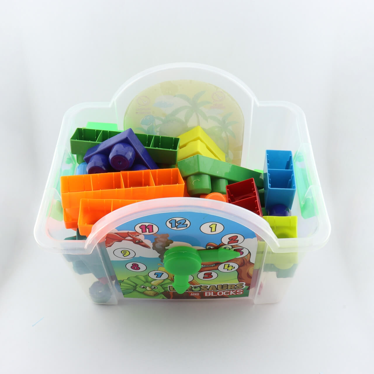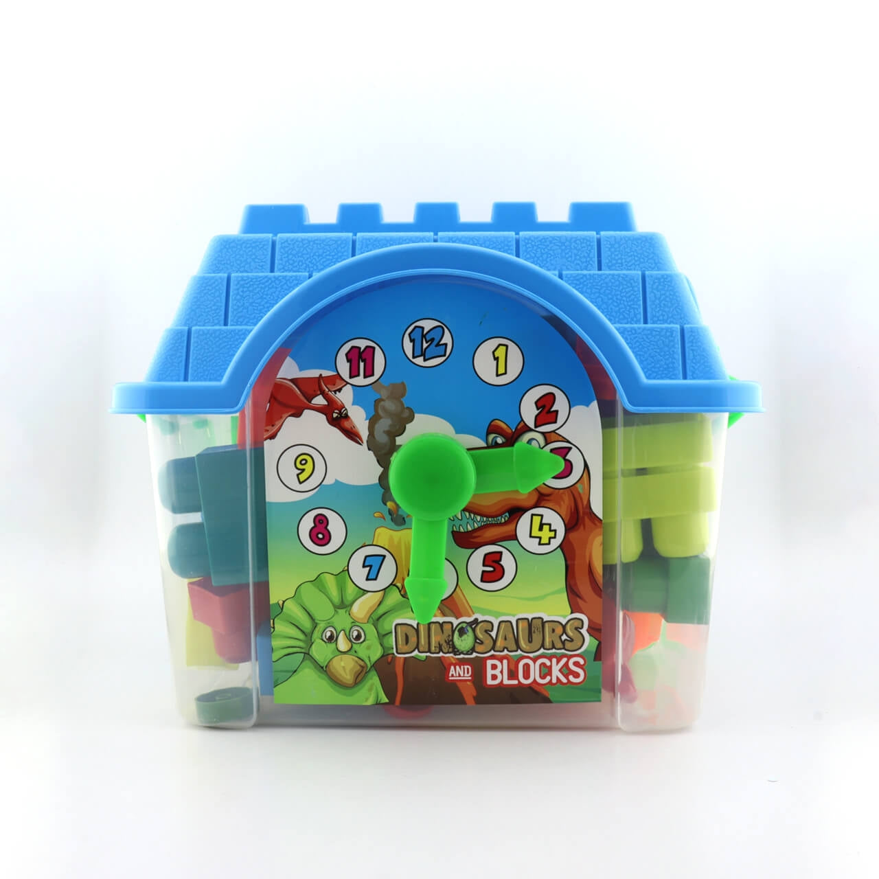 Casa en plástico resistente, recipiente de fichas tipo lego o arma-todo, posee divertido reloj didáctico.