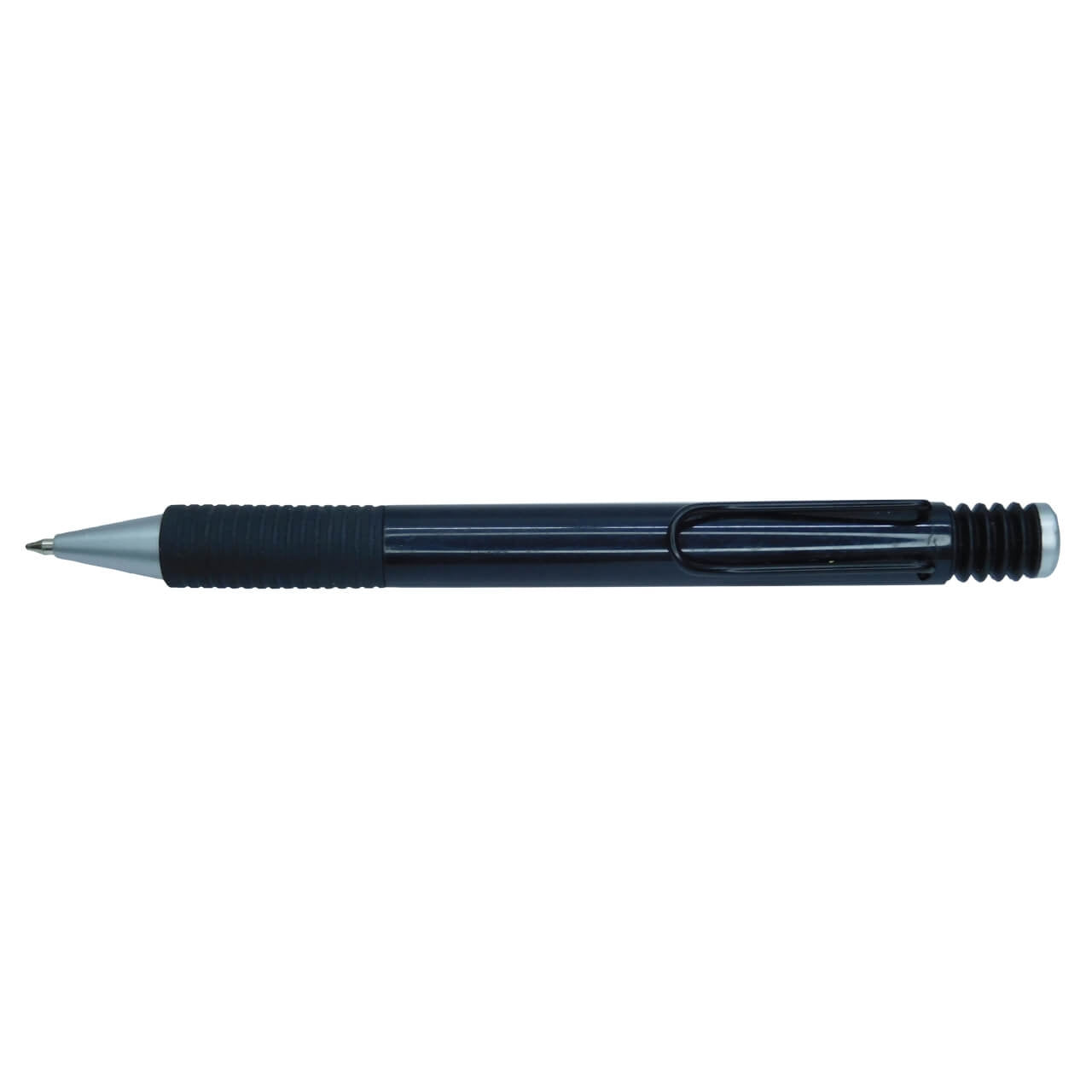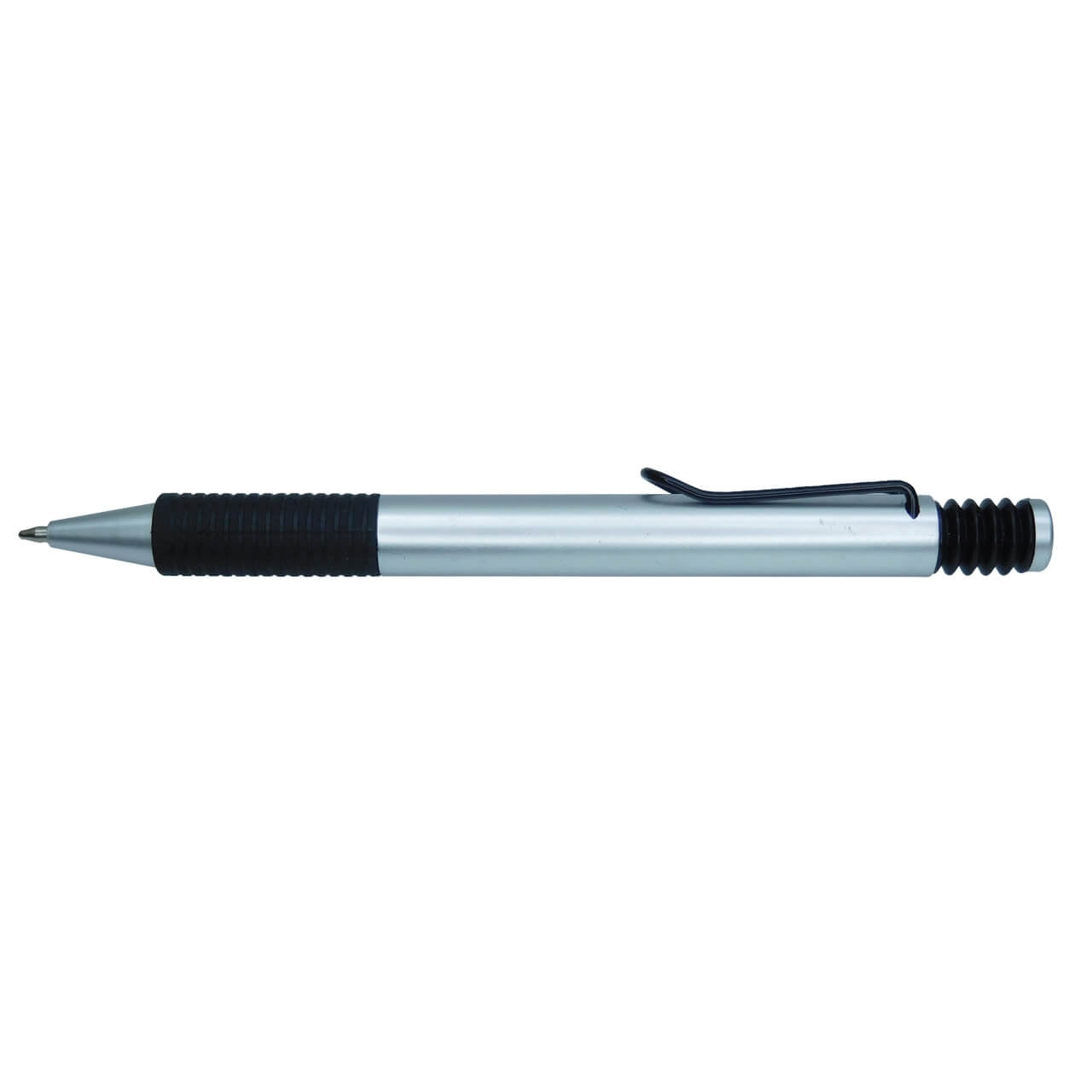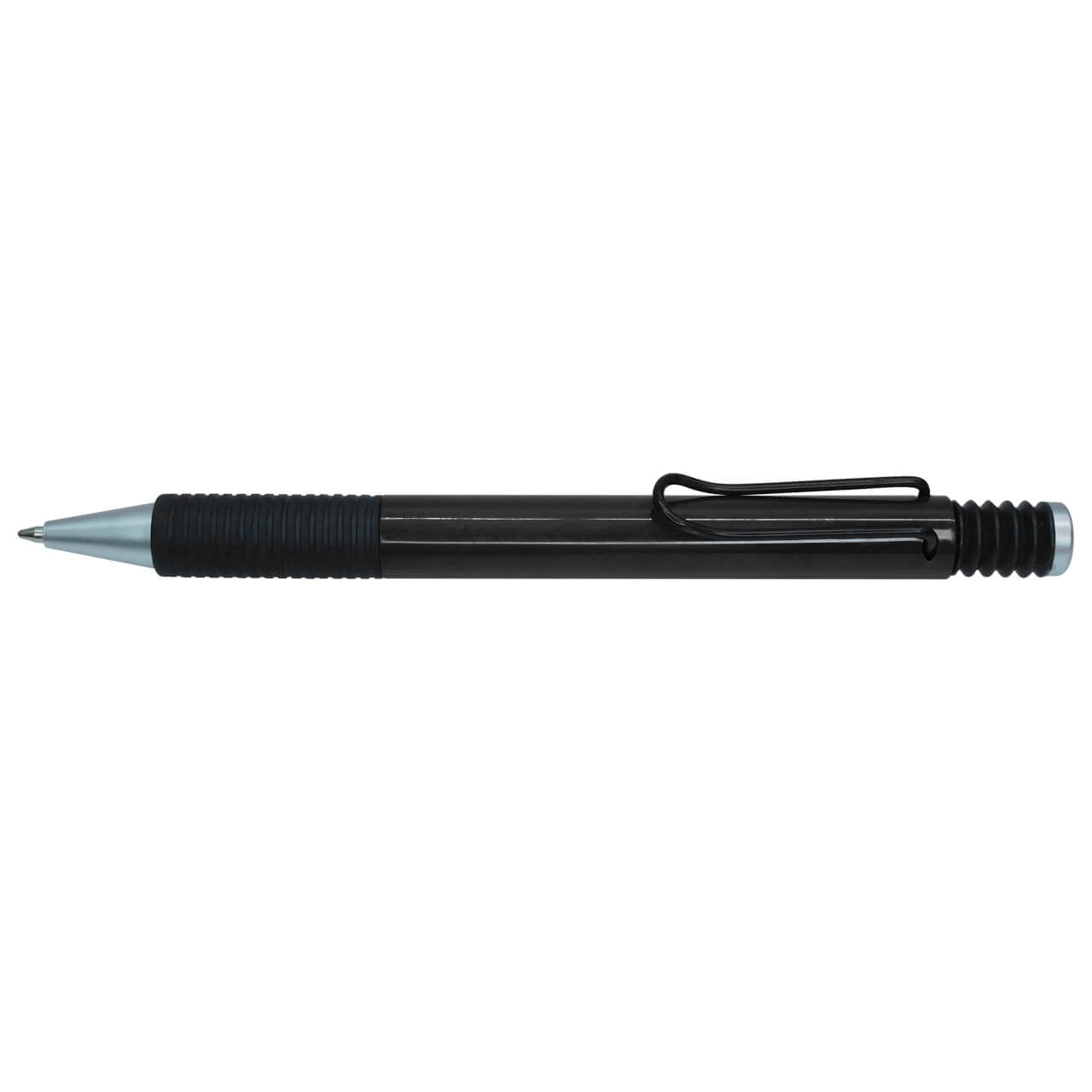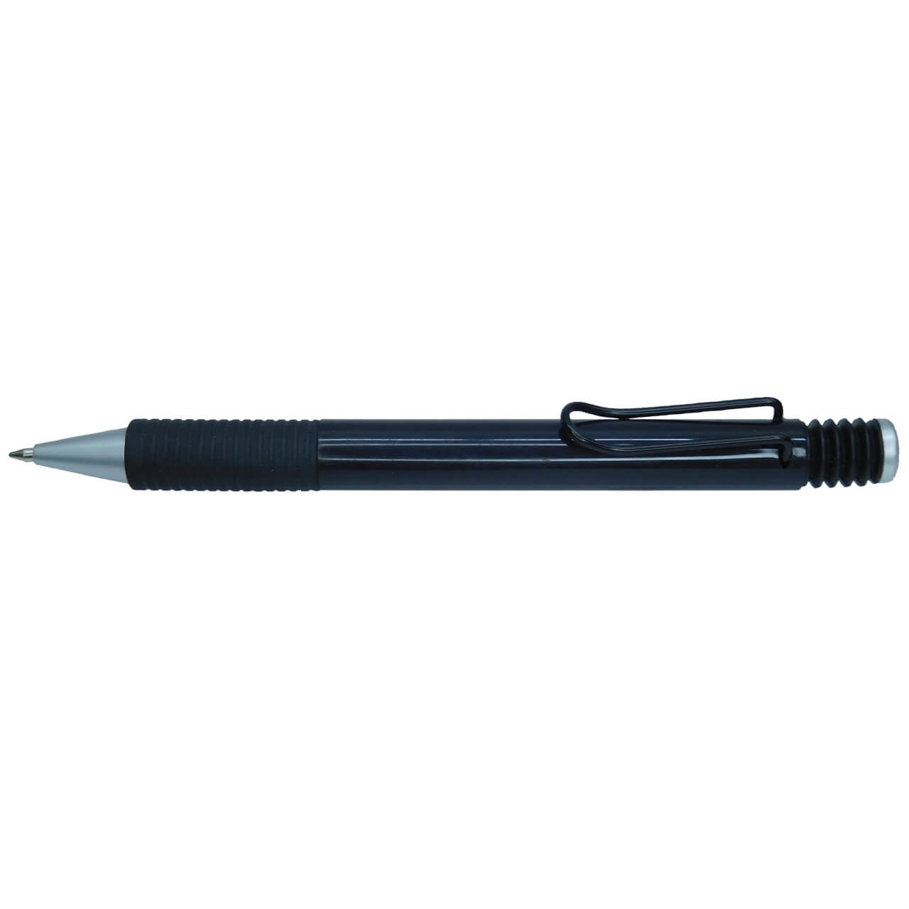 Esfero plástico retráctil con clip y antideslizante negro.