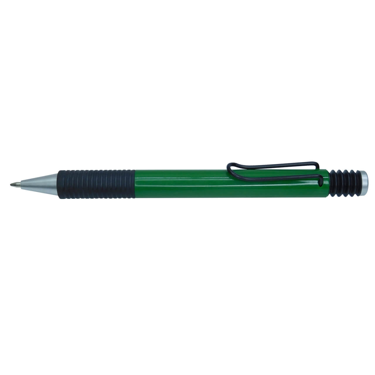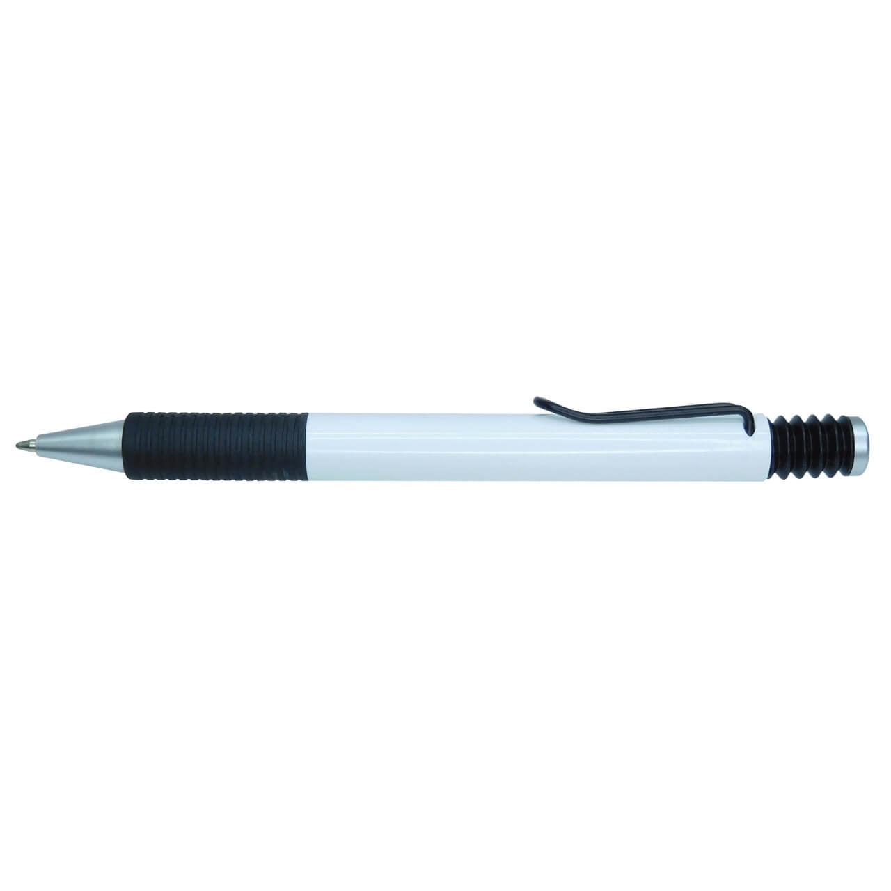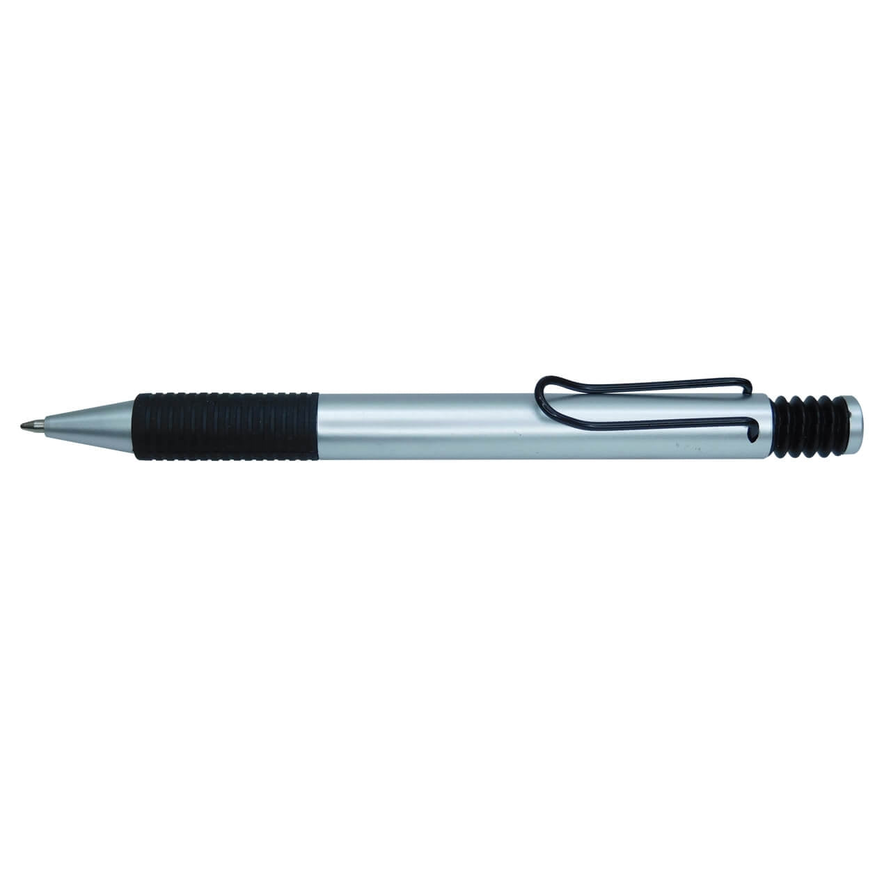 Esfero plástico retráctil con clip y antideslizante negro.