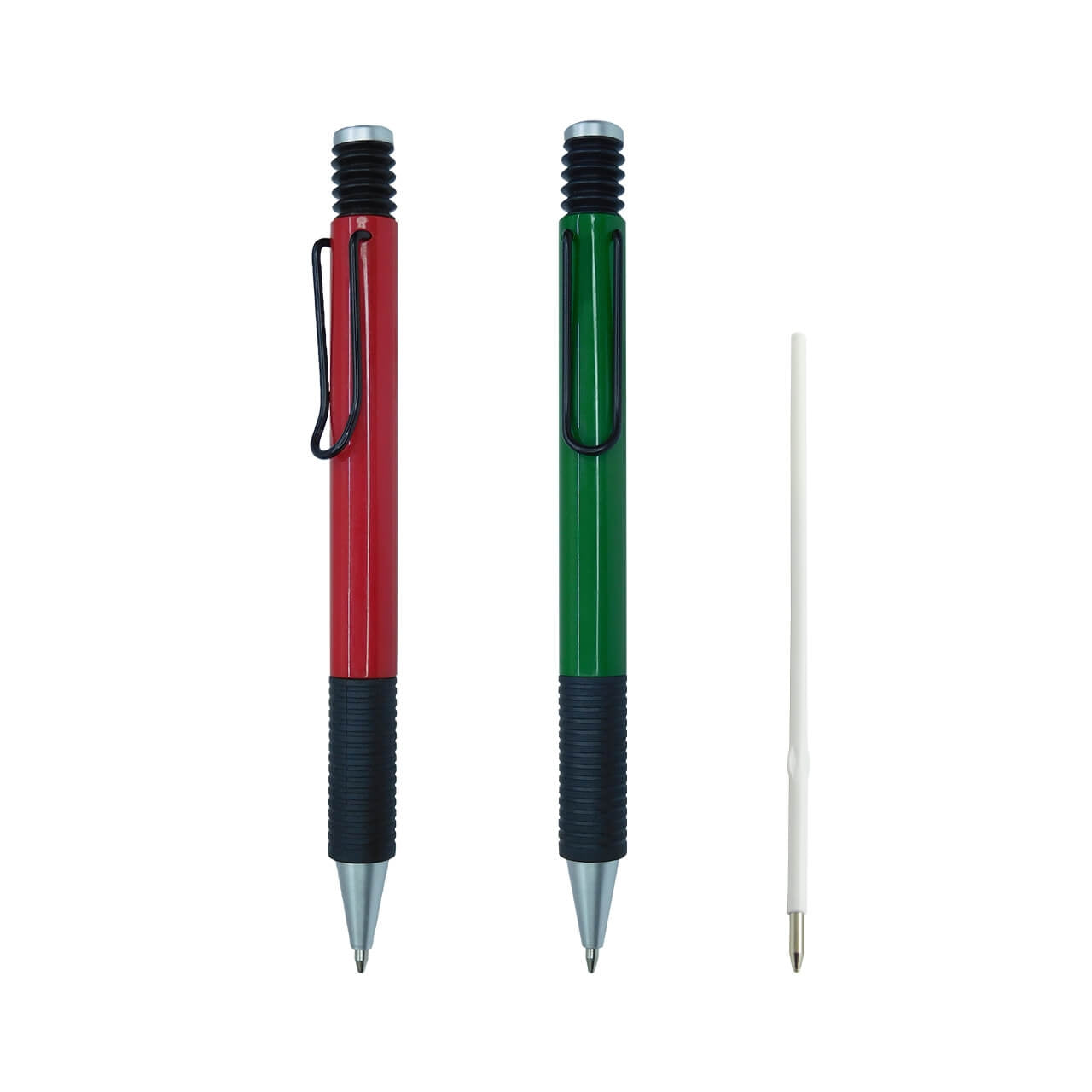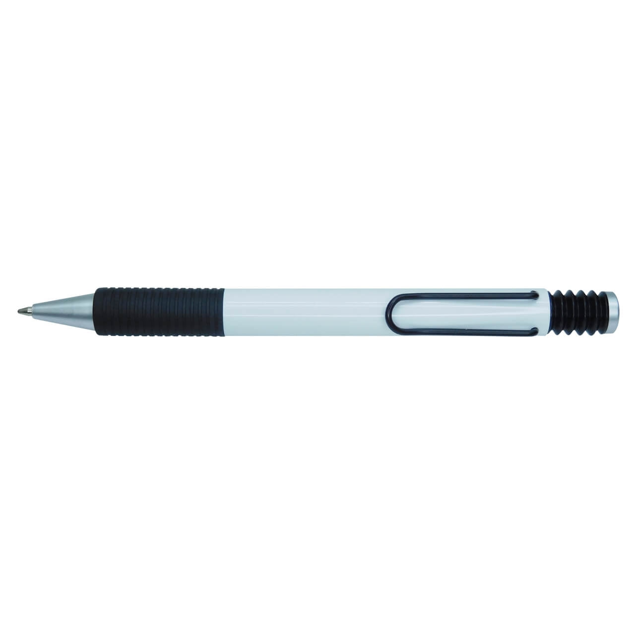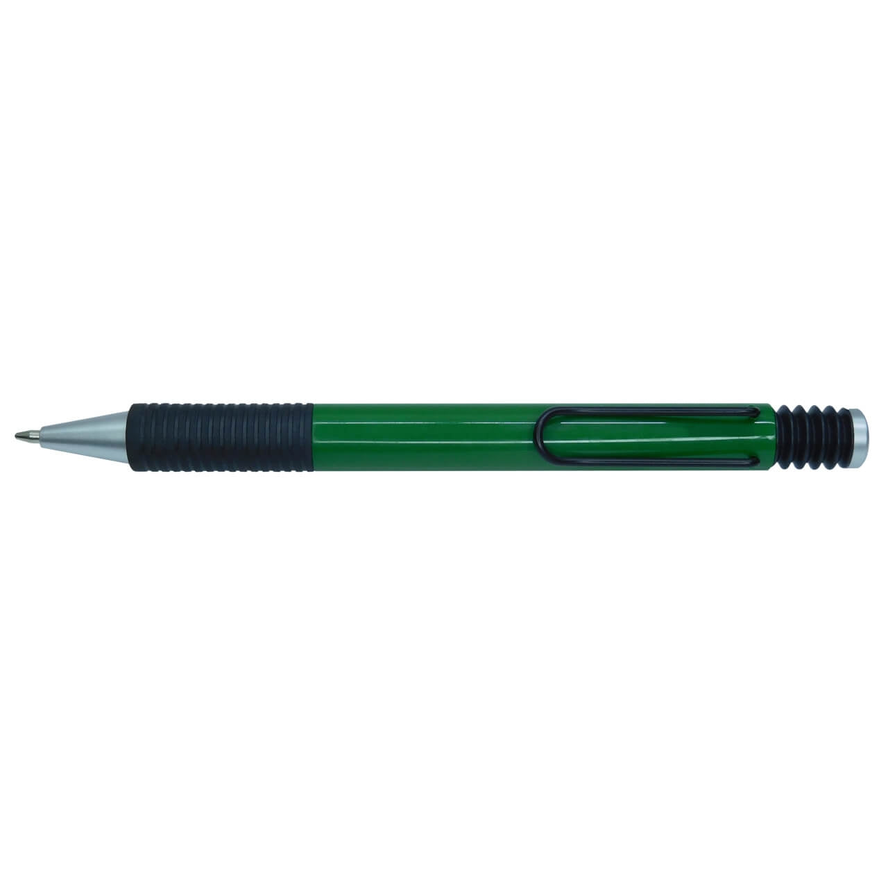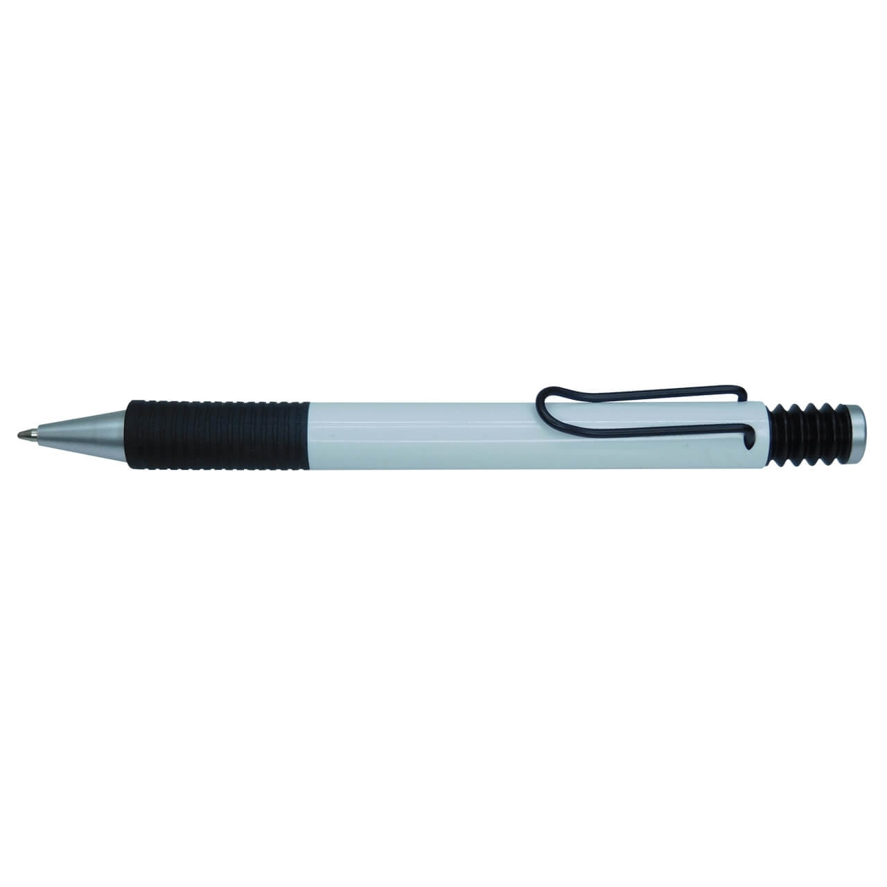 Esfero plástico retráctil con clip y antideslizante negro.