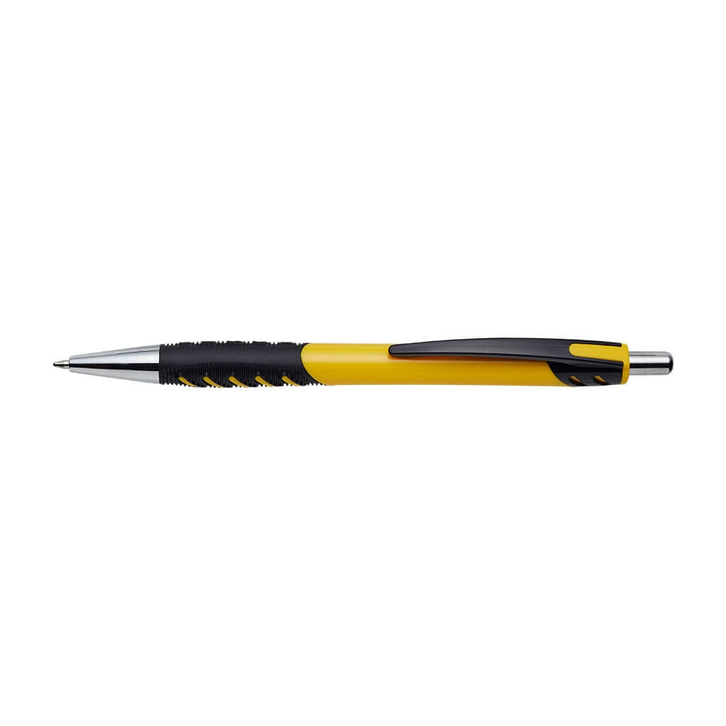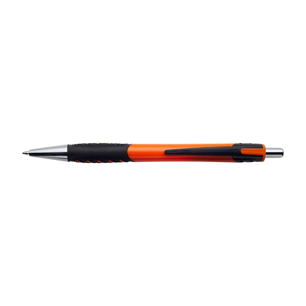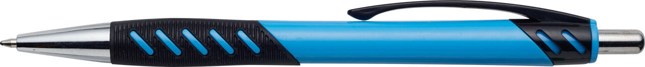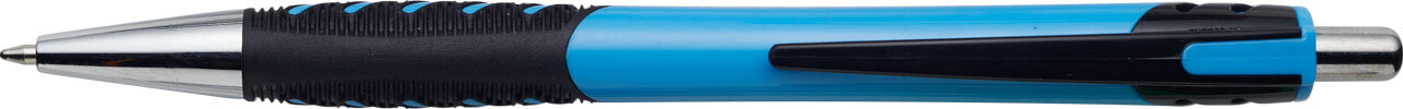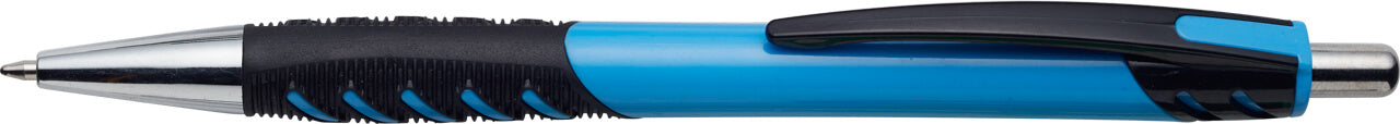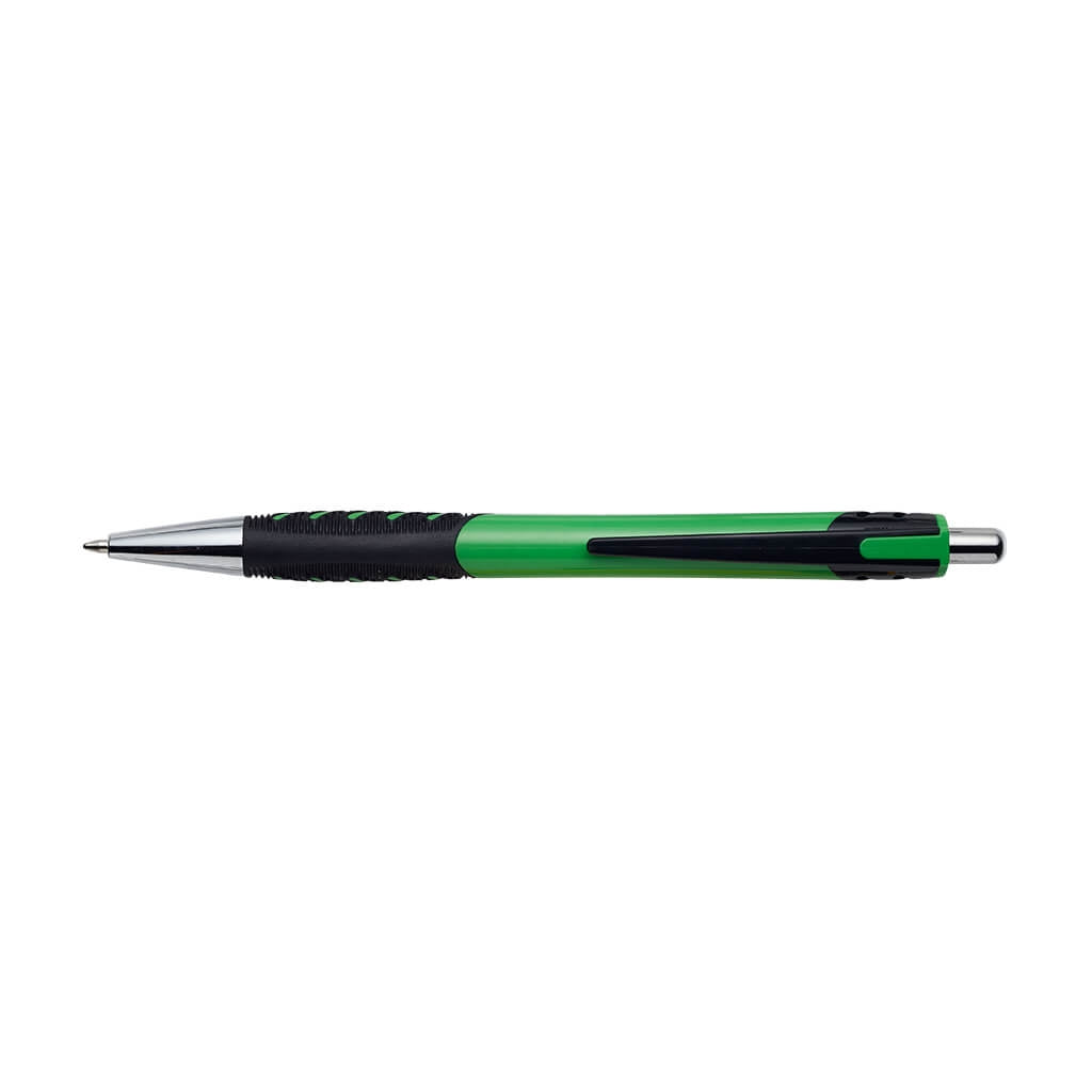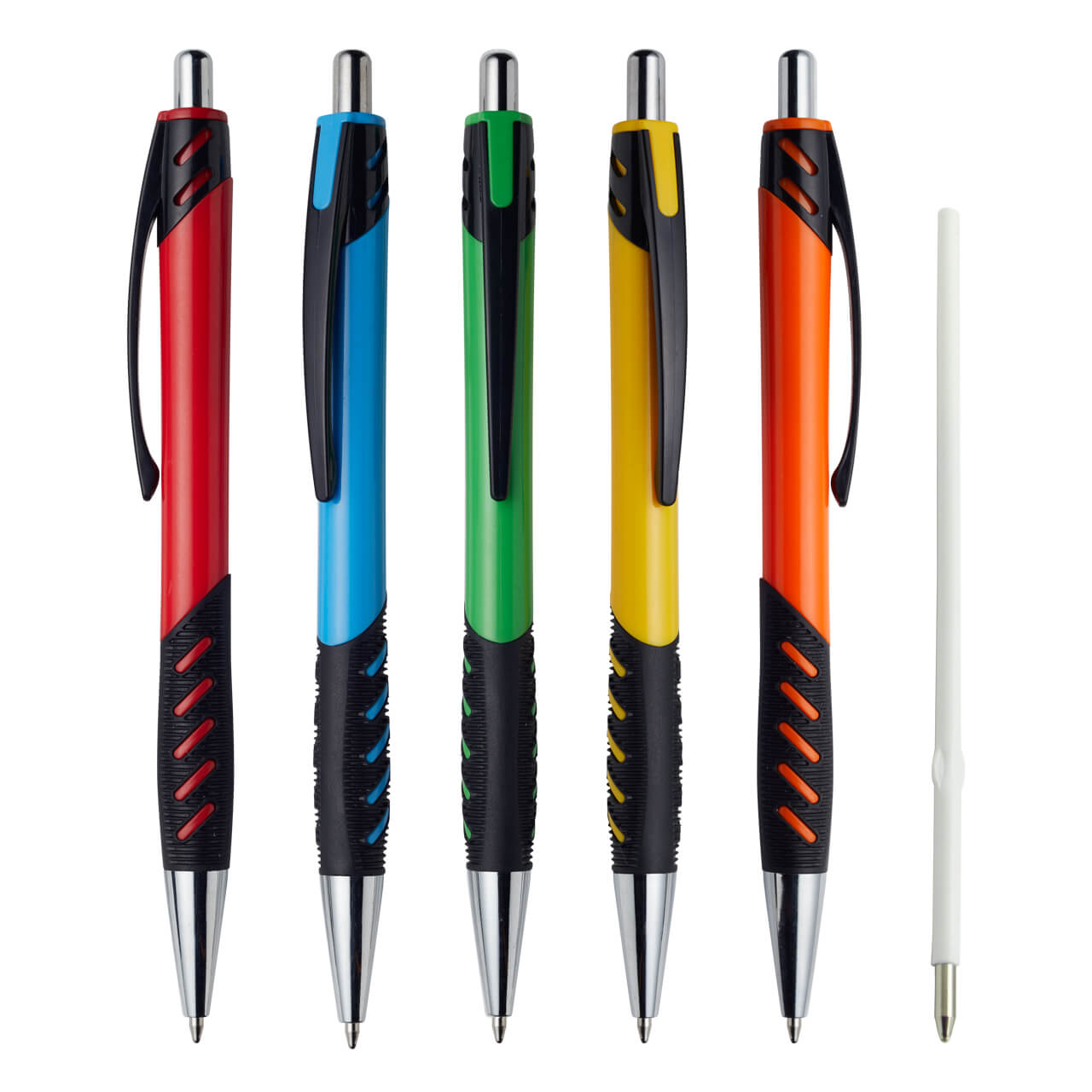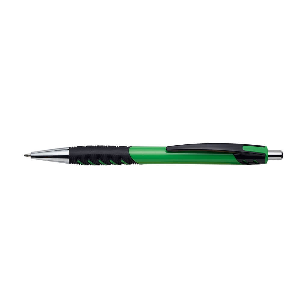 Esfero plástico brillante, goma antideslizante, clip y punta cromada.