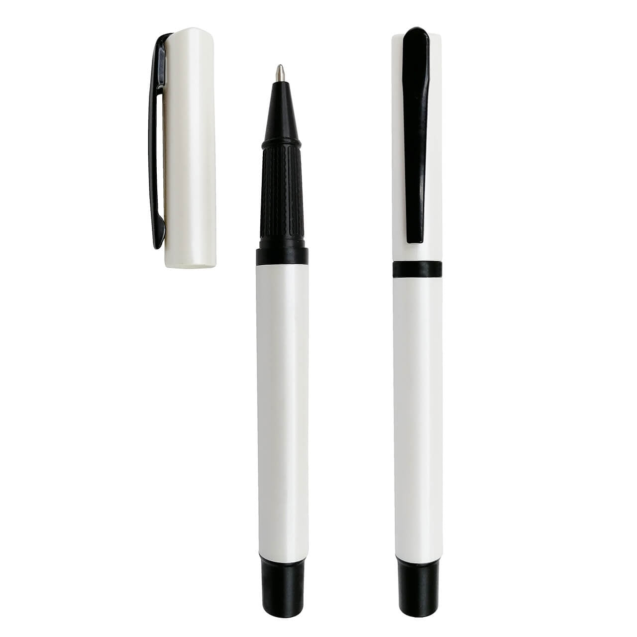 Esfero plástico blanco perlado, tapa con clip y punta negra.