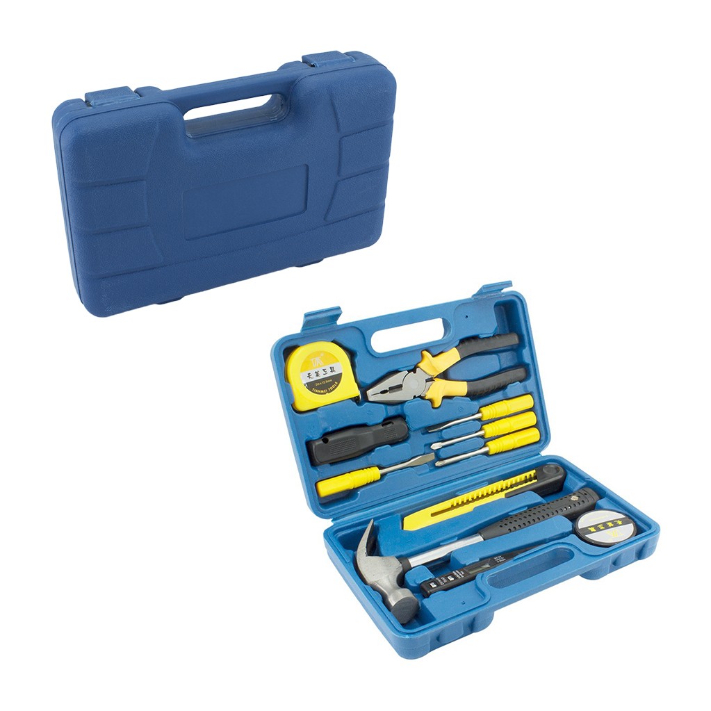 Incluye: metro, alicate, destornilladores, bisturí, martillo, tester y cinta aislante.