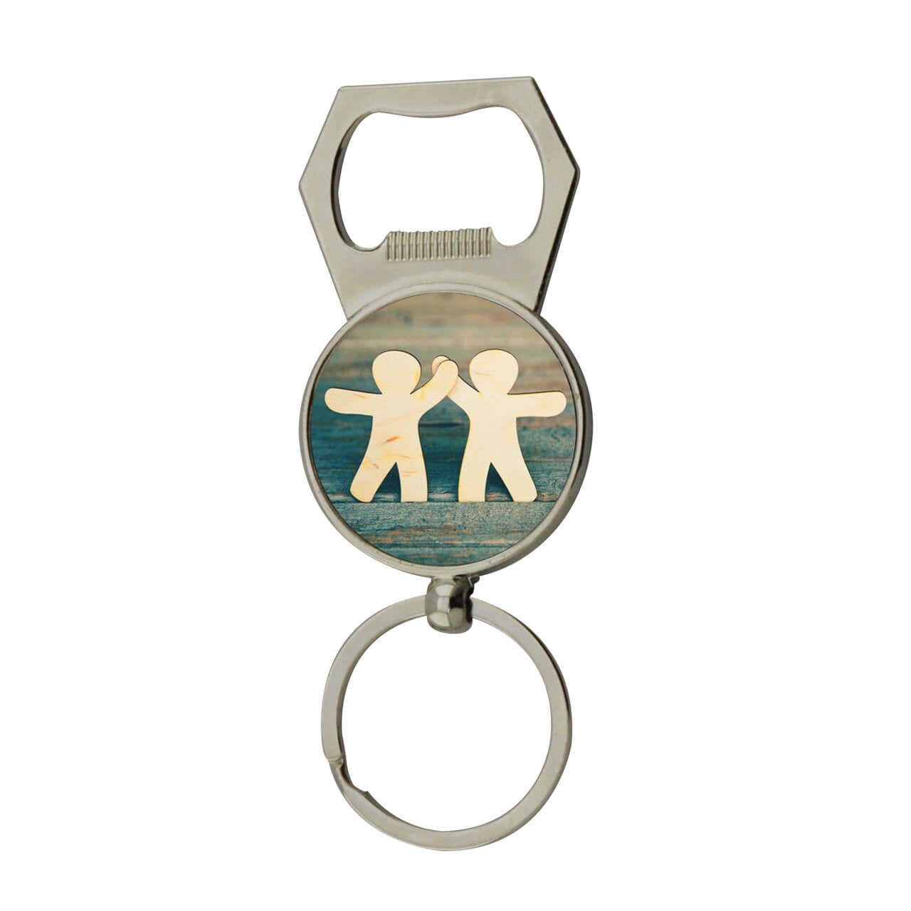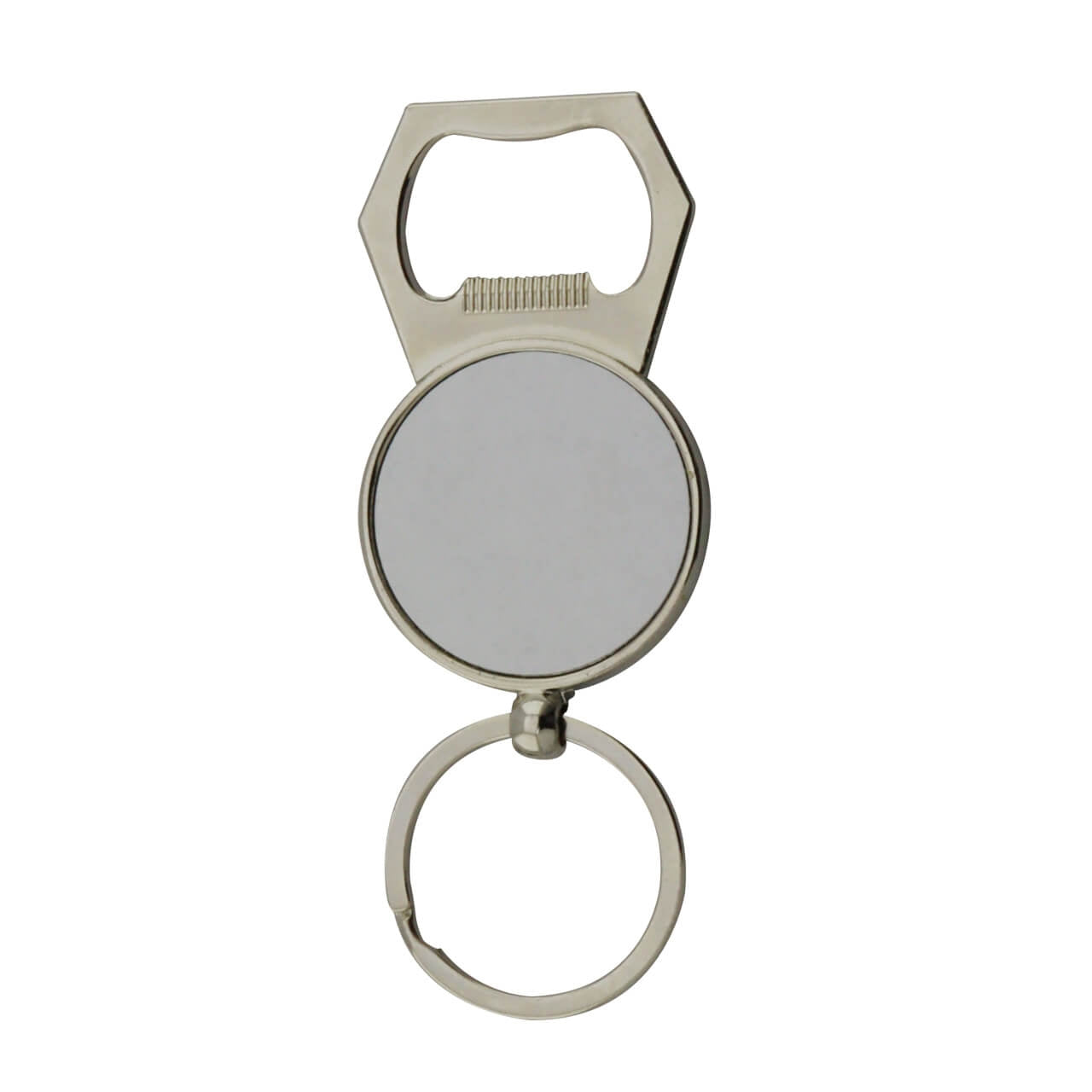 Llavero destapador con forma circular.