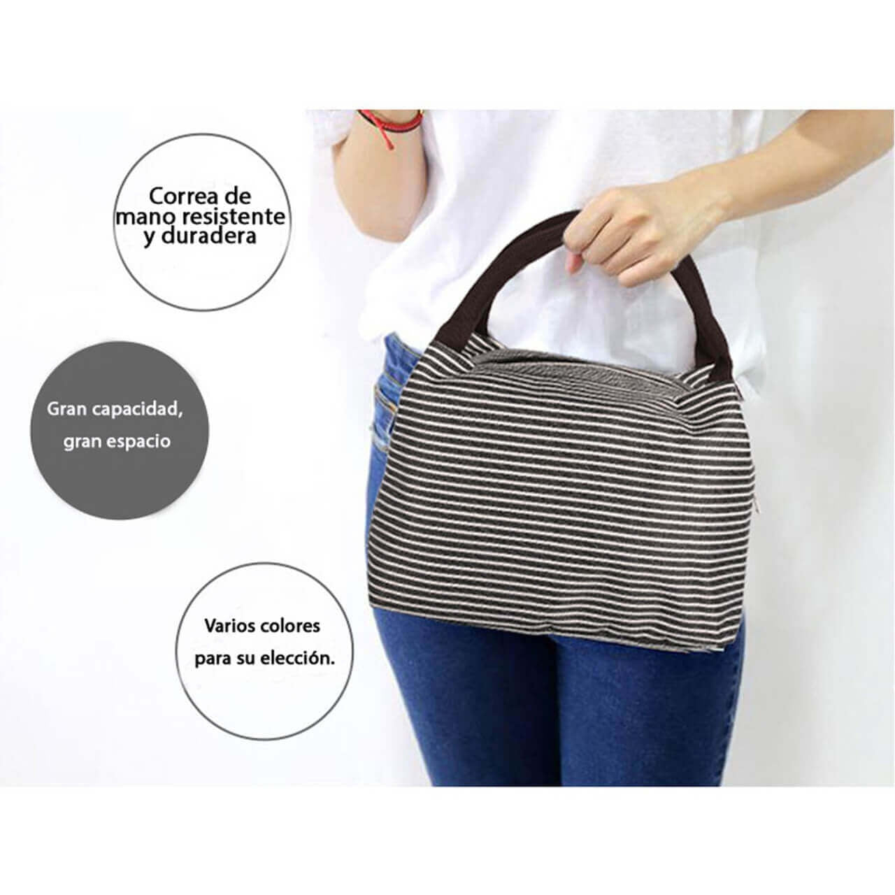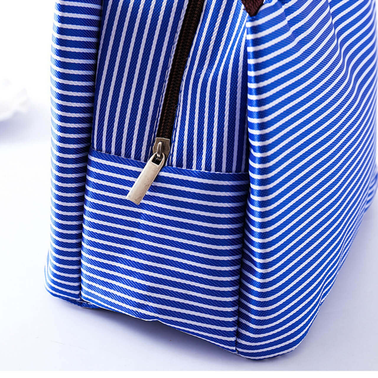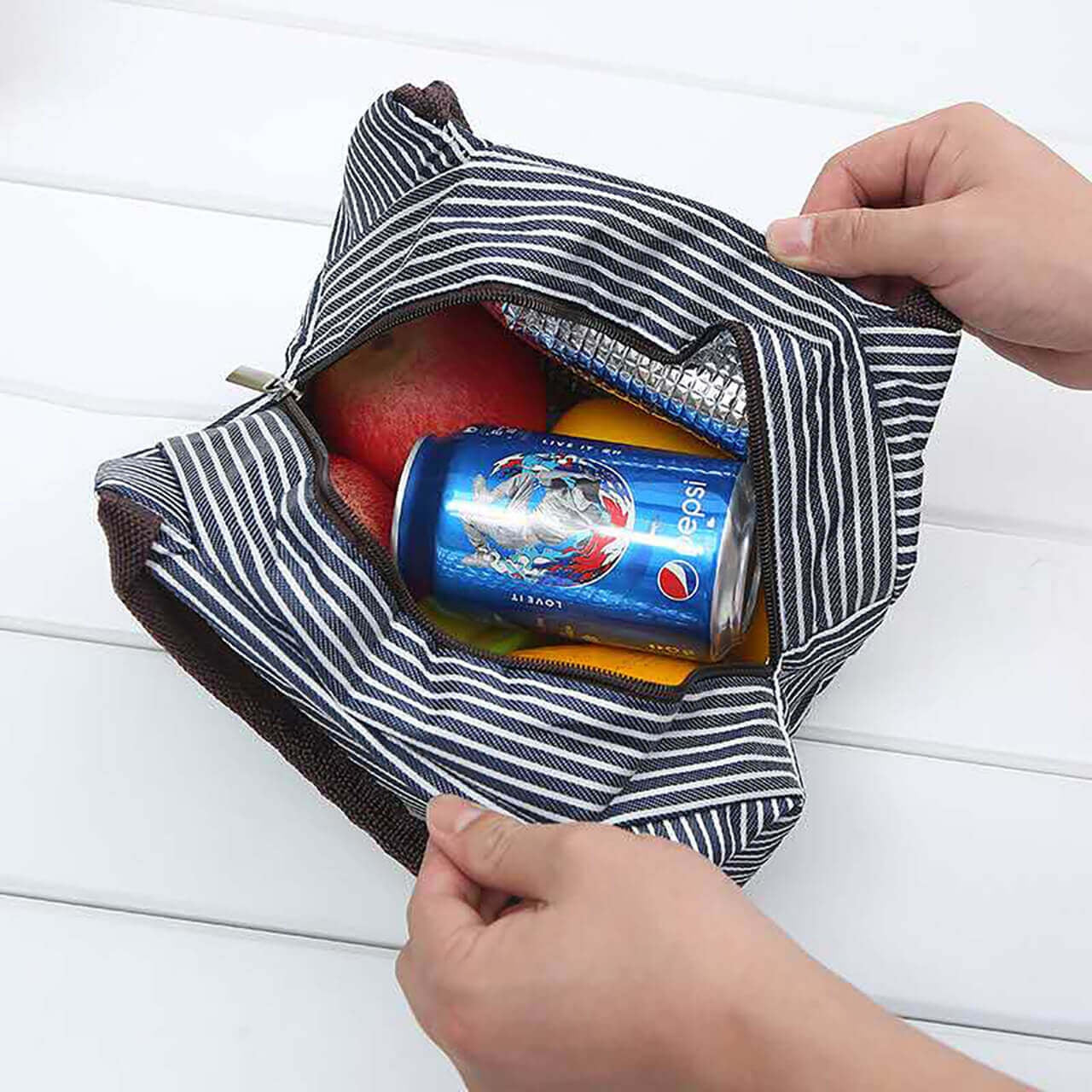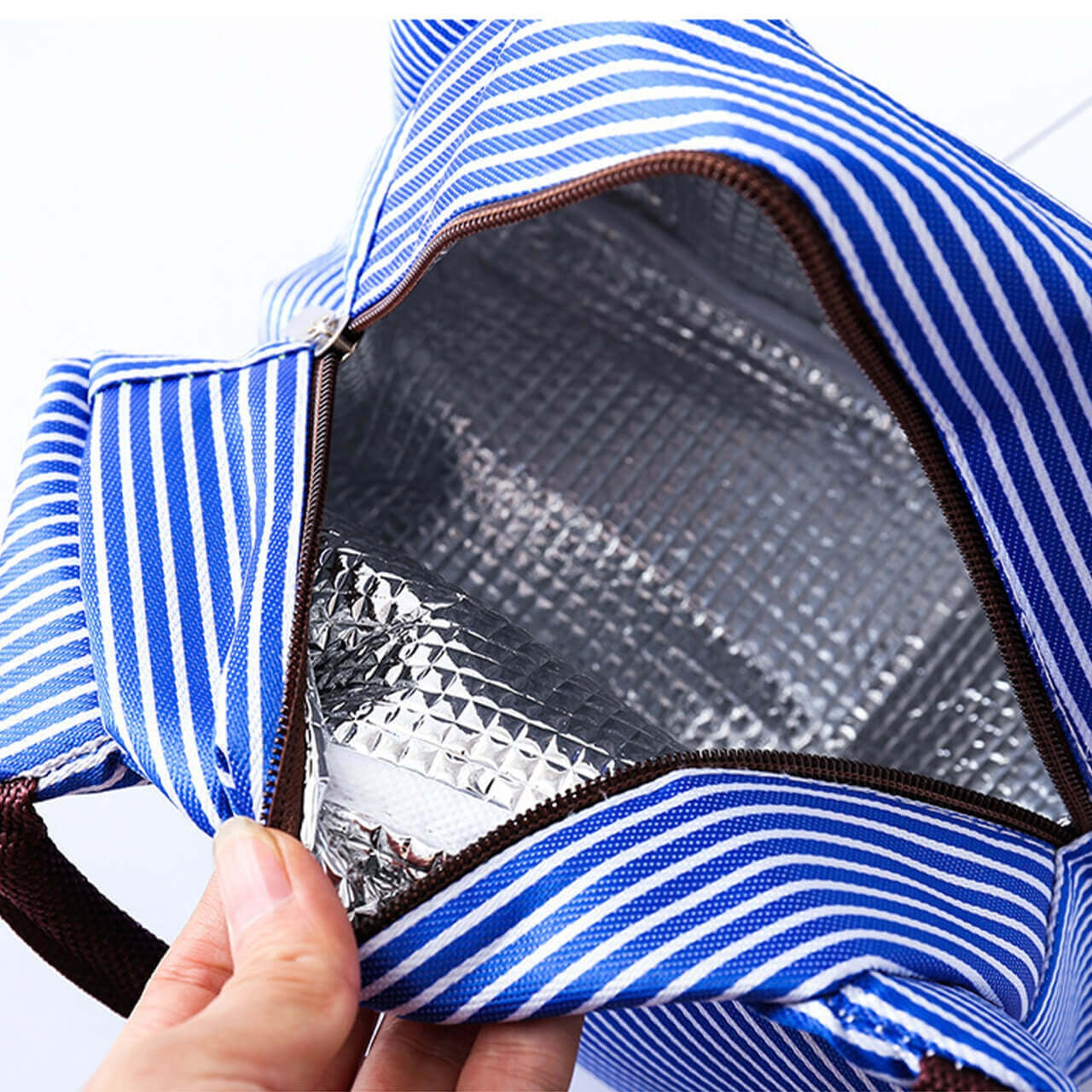 Lonchera para alimentos con cremallera, en poliéster, con recubrimiento térmico interno.