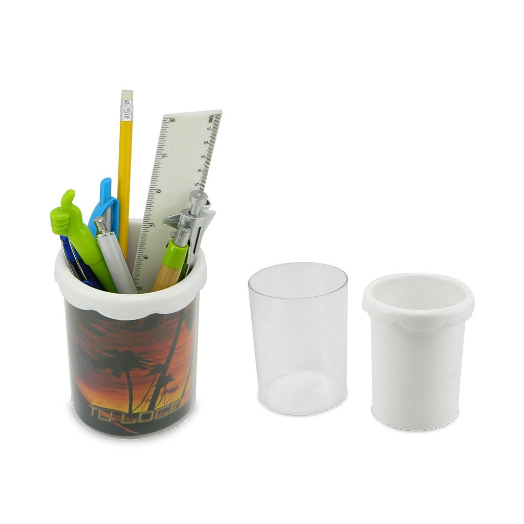 Porta esfero de dos cuerpos para insertar publicidad impresa, personalizable.